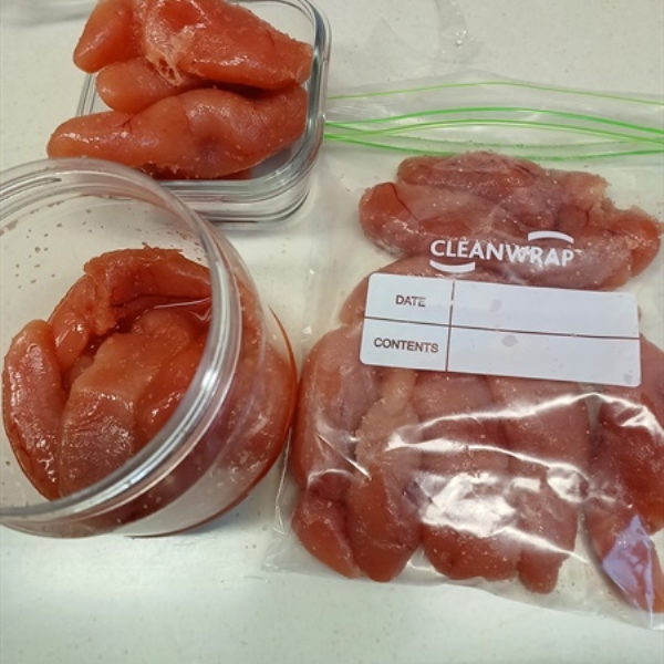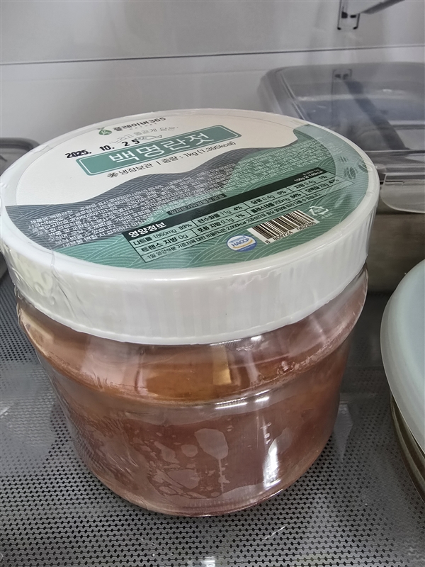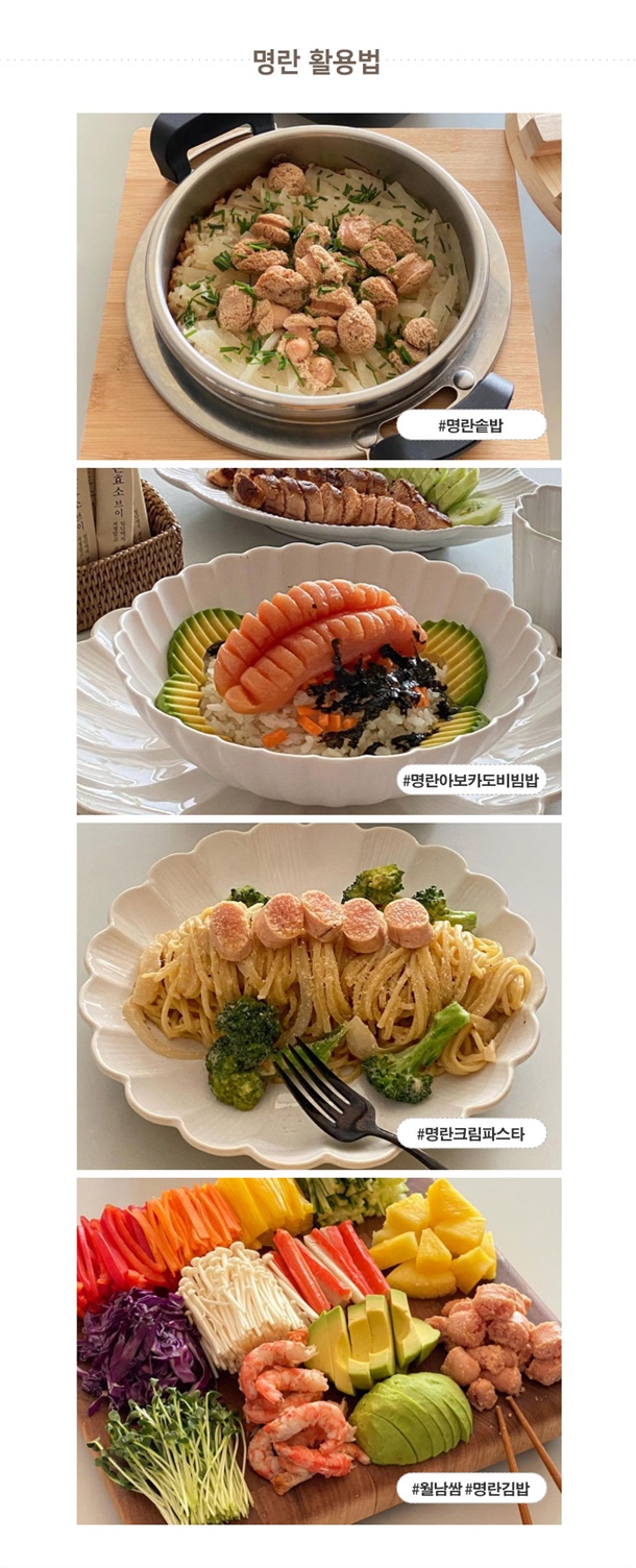 | 원재료 함량 | 명란젓: 참명란젓97.4%[명태알(러시아산)81.6%, 정제소금(국내산)6%, 사과산Na3%, 소비톨, L-글루탐산나트륨(향미증진제), 혼합제제(명신레드색소-오에스), 아질산나트륨(발색제)0.0005%], 설탕1.2%, 고춧가루(건고추:중국산)0.5%, 파프리카색소, 소비톨, 마늘(국내산) / 백명란젓: 명태알(러시아산)83.5%, 정제소금(국내산)4%, 사과산Na3%, L-글루탐산나트륨(향미증진제), 미향, 소비톨, 비타민C-Na, 글리신, 설탕, 젖산Ca, 캅시쿰분말, 아질산나트륨(발색제)0.0005% |