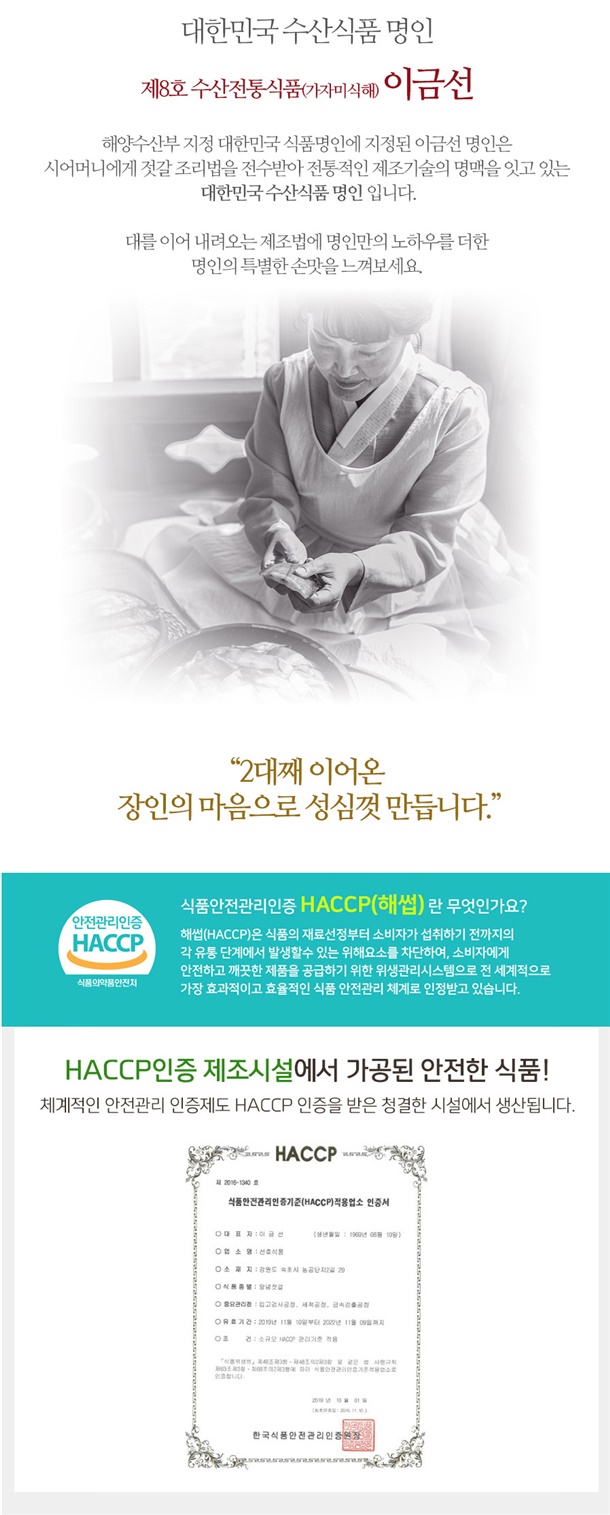 | 소비자 주의사항 | 이 제품은 대두, 게, 땅콩, 밀, 새우, 오징어, 우유, 조개류(굴, 가리비포함)를 사용한 제품과 같은 제조시설에서 제조하고 있습니다. |