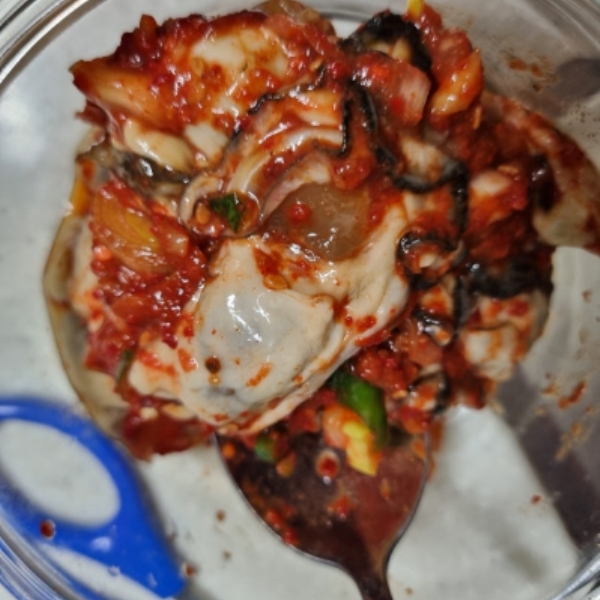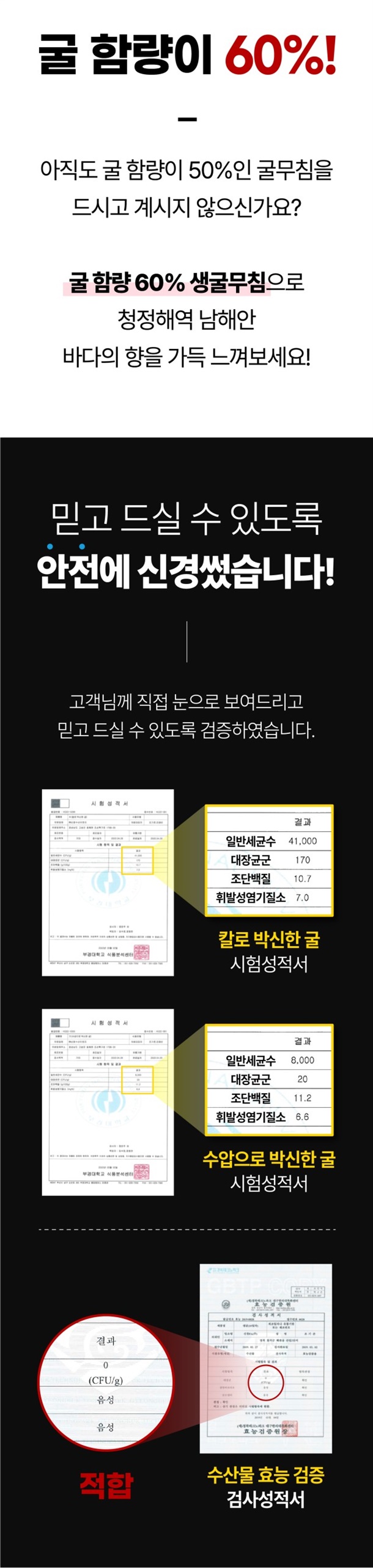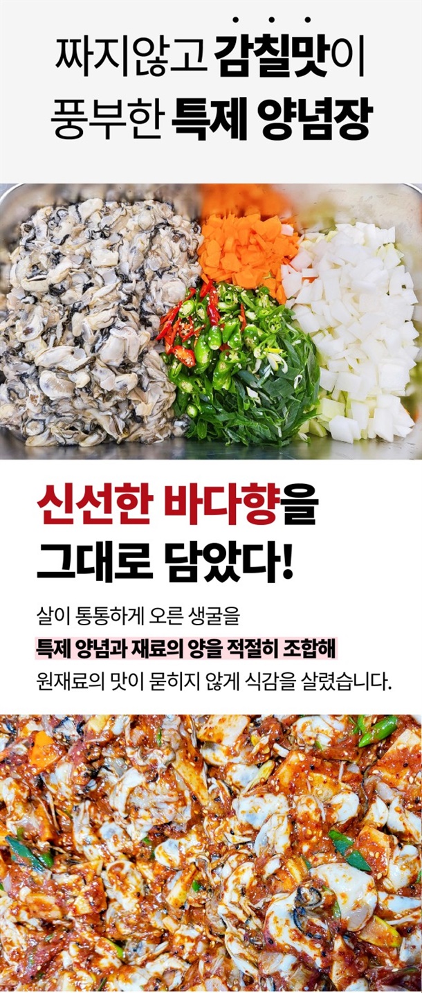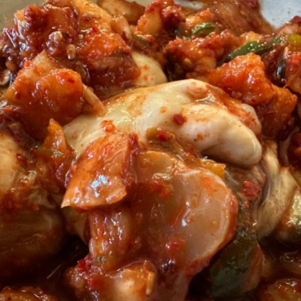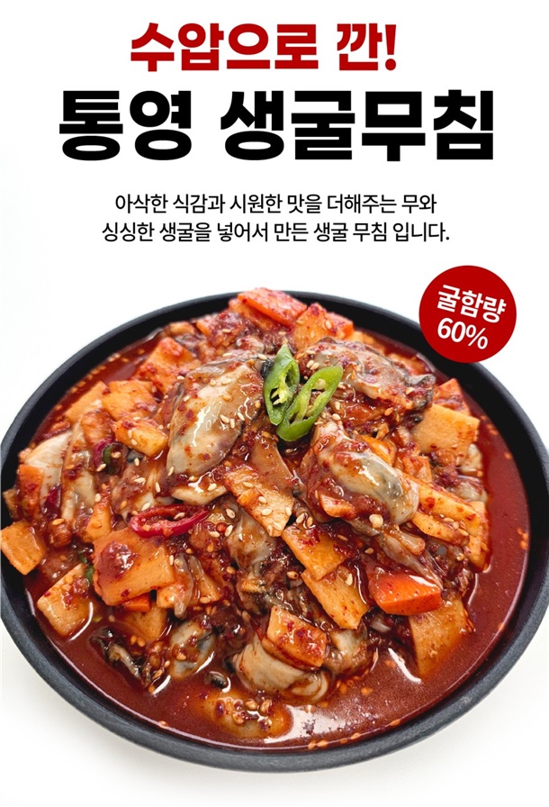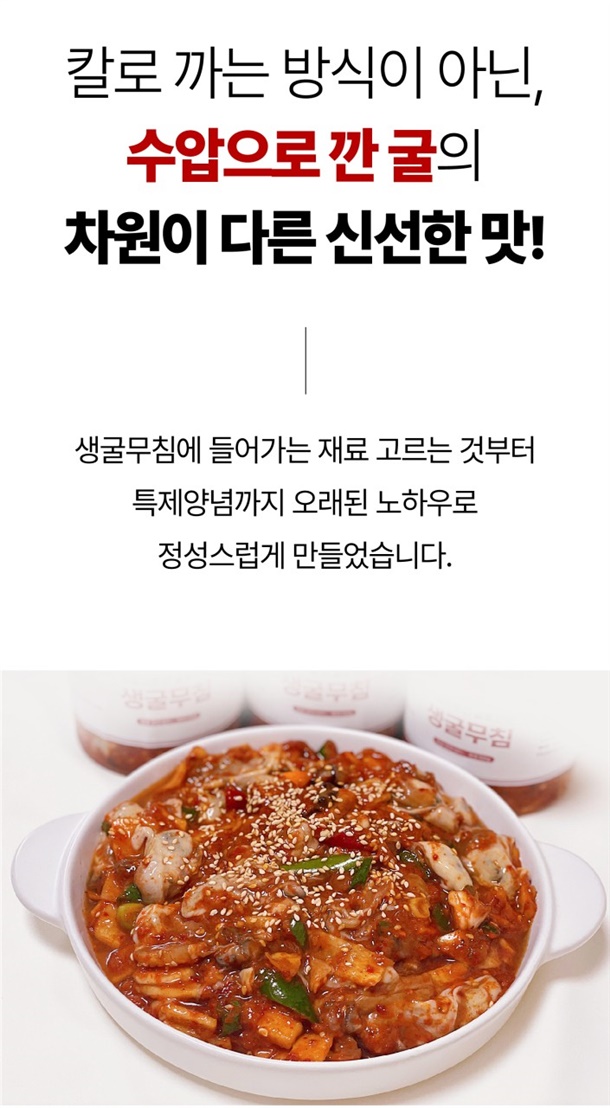 | 원재료 함량 | 굴 60%(국산), 무10.32%(국산), 고추장4.13%[물역,소맥분(밀:미국산,호주산),고추양념(중국산),밀쌀,정제소금],마늘(국산),설탕,혼합간장,물엿,대파(국산),당근2.06%(국산),청양고추1.85%(국산),조미액젓,고춧가루(국산50%,중국산50%),홍고추(국산),볶음통깨(인도산),복합조미식품,후추가루,생강가루 |
