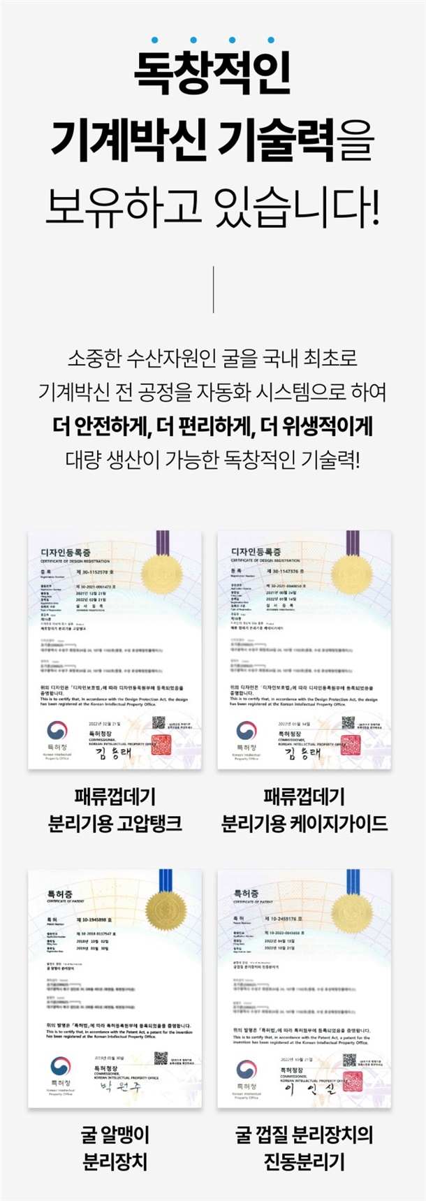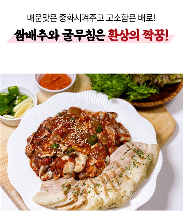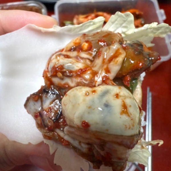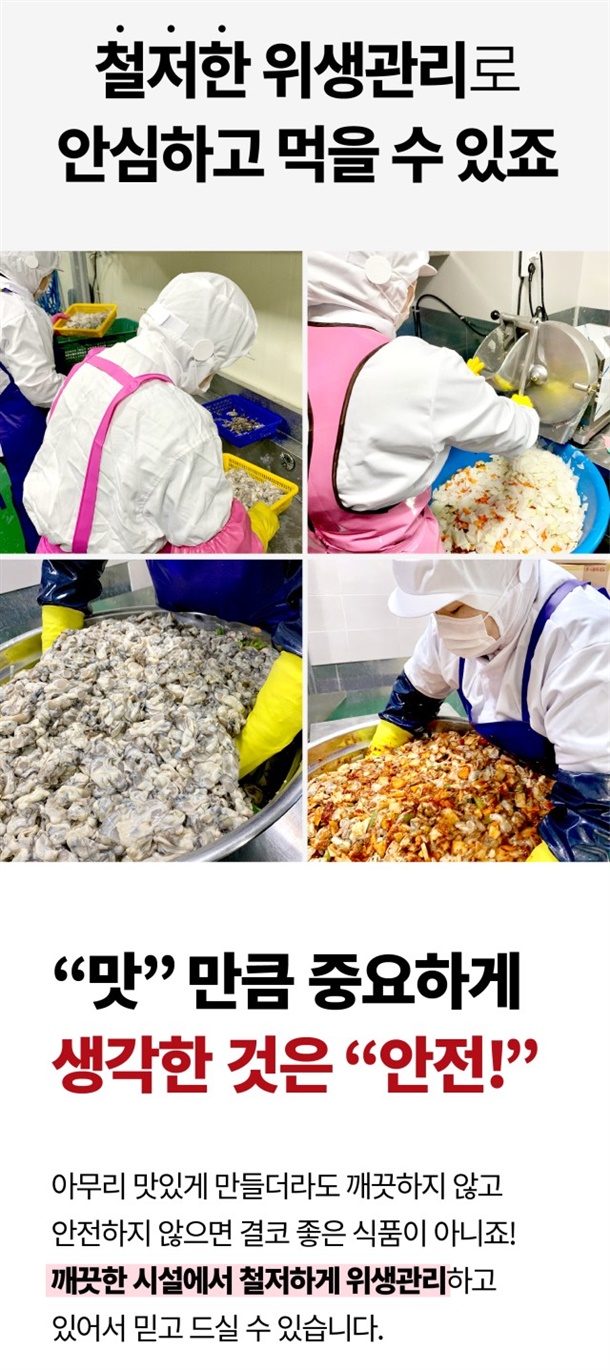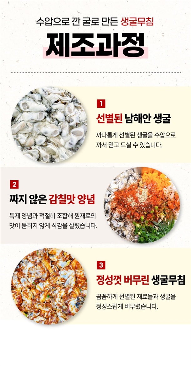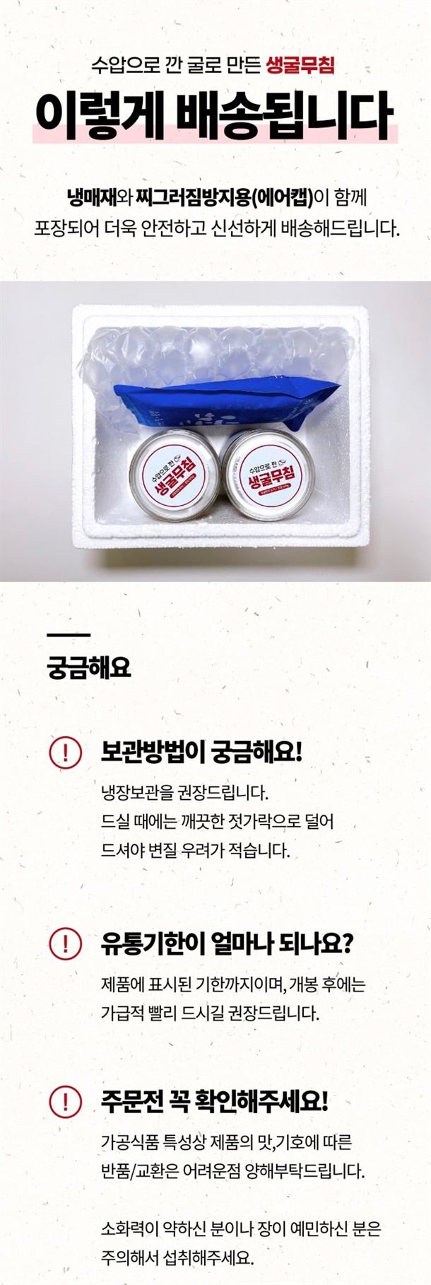 | 원재료 함량 | 굴 60%(국산), 무10.32%(국산), 고추장4.13%[물역,소맥분(밀:미국산,호주산),고추양념(중국산),밀쌀,정제소금],마늘(국산),설탕,혼합간장,물엿,대파(국산),당근2.06%(국산),청양고추1.85%(국산),조미액젓,고춧가루(국산50%,중국산50%),홍고추(국산),볶음통깨(인도산),복합조미식품,후추가루,생강가루 |